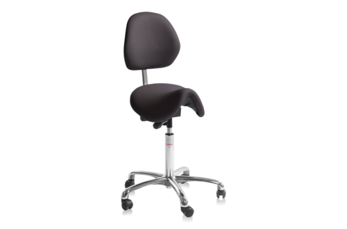 Klassischer Sattelstuhl mit Rückenlehne und gepolstertem Sitz mit schwarzem Kunstlederbezug. Stufenlos verstellbare Rücken- und Sitzneigung für optimale Sitzposition und erhöhte Ergonomie. Der Sattelstuhl verfügt über eine Fußstütze aus poliertem Aluminium und ist mit leichtlaufenden Rollen ausgestattet, die ein einfaches Bewegen am Arbeitsplatz ermöglichen. Höhenverstellung 580–770 mm.