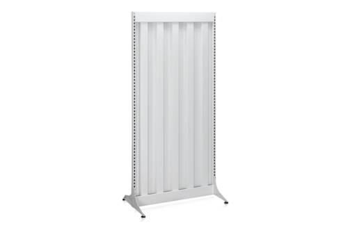 Bei dieser Variante handelt es sich um ein doppelseitiges (T-Ständer) Startelement zur freien Montage auf dem Boden. Damit die Wand verstellbar ist und auch auf unebenen Industrieböden stabil steht, sind Stabilisierungsfüße angebracht. Kann auch schräg gebaut werden (siehe Zubehör). Die Rückwand ist ein dünner, gefalteter Blechrücken mit geringem Gewicht und selbsttragender Konstruktion.