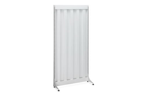 Abschirmwand für Arbeitsplätze im industriellen Umfeld. Die Trennwand hat einen Abstand von 900 mm zwischen den Säulen und kann daher mit unserem Standardzubehör wie Regalen, Panelen und Rückleisten ergänzt werden, um in derselben Lösung Stauraum zu schaffen.