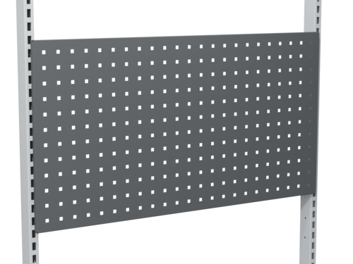 Lochrasterplatte mit integrierten Haken zur Befestigung an Lochsäulen. Die Lochrasterplatte liegt direkt an der Stütze, um Spiel zu vermeiden und geht 14 mm über die Lochsäule hinaus Blechdicke 1,5 mm, Lochung 9x9 mm und Lochabstand c/c 38 mm. 14 mm rundum gebogene Kante. Grau lackiert, NCS S 6502B.
