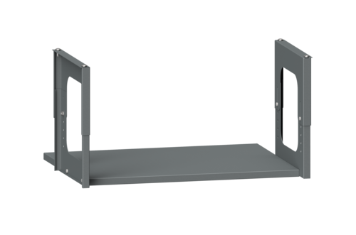 Zwischenboden für elektrisch höhenverstellbare Tische zur praktischen Aufbewahrung von Druckern und Verpackungsmaterial. Der Zwischenboden ist in der Höhe und seitlich verstellbar.
