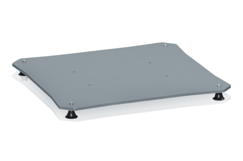 Bodenplatte (500x500 mm) mit Stellfüßen zum Aufstellen auf unebenen Industrieböden. Hergestellt aus starkem 8-mm-Stahlblech, pulverbeschichtet in Grau RAL 7012. Passend für alle MC14-Hubsäulen. Zur Verschraubung mit einer Montageplatte.