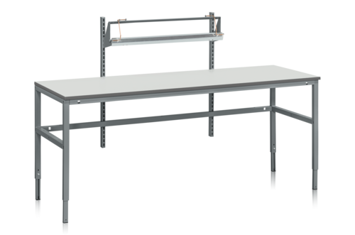 Kompletter Packtisch mit graulackiertem Rahmen, höhenverstellbaren Beinen, Tischplatte aus Laminat (2000x800x24 mm), 2 Lochsäulen (1000 mm) und Papierabreißer. Maximale Belastung 300 kg verteiltes Gewicht. Minimale Höhe 730 mm, maximale Höhe 980 mm. Harte und kratzfeste Laminattischplatte mit hoher Widerstandsfähigkeit gegen Flüssigkeiten und Chemikalien. Leicht zu reinigen. Kante in grau ABS. Der Arbeitstisch wird unmontiert geliefert.
