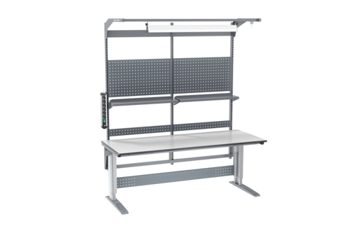 Der Arbeitstisch wird standardmäßig mit einer Laminat-Tischplatte geliefert, die eine harte und kratzfeste Oberfläche hat, mit einer guten Beständigkeit gegen Flüssigkeiten und Chemikalien. Einfach abzuwischen und sauber zu halten. Somit für die meisten Industrie- und Logistikumgebungen geeignet. Die Laminatplatte ist 24 mm stark und hat eine Kante aus 2 mm grauem ABS-Kunststoff.