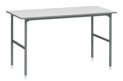 Kompletter Arbeitstisch mit Tischplatte aus grauem Laminat (1600x800x24), Anbaurahmen und C-Profil. Maximale Belastung 300 kg verteiltes Gewicht. Tischhöhe 900 mm. Tischplatte aus Laminat für einfache Montagearbeiten, mit harter und kratzfester Oberfläche mit hoher Widerstandsfähigkeit gegen Flüssigkeiten und Chemikalien. Leicht zu reinigen. Kante in grau ABS. Die Tischplatte hat einen massiven Holzkern und ist mit einer Holzfaserplatte verleimt.