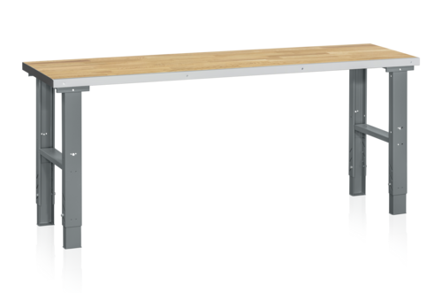 Kompletter Arbeitstisch mit zwei manuell justierbaren Beinrahmen aus Stahl und einer vielseitig einsetzbaren Tischplatte aus Eichenparkett (2000x600x40 mm). Maximale Belastung 500 kg verteiltes Gewicht. Minimale Höhe 745 mm, maximale Höhe 1015 mm. Die Tischplatte mit Eichenparkett ist für einfache Montage- und Werkstattarbeiten einsetzbar. Schlagfeste Platte mit robuster Oberfläche. Vorderkante aus Aluminium. Längskanten mit grauem ABS Leisten. Die Tischplatte hat einen massiven Holzkern und ist mit einer Holzfaserplatte verleimt.