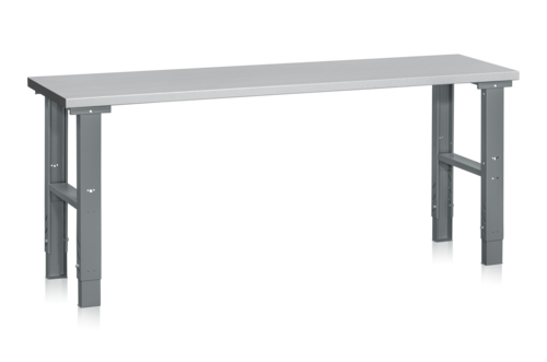 Kompletter Arbeitstisch mit zwei manuell justierbaren Beinrahmen aus Stahl und einer vielseitig einsetzbaren Tischplatte aus Stahlblech (2000x600x40 mm). Maximale Belastung 500 kg verteiltes Gewicht. Minimale Höhe 745 mm, maximale Höhe 1015 mm. Die Tischplatte aus Stahlblech ist für schwere Montage- und Werkstattarbeiten einsetzbar. Eine robuste Platte mit kratzfester und leicht zu reinigender Oberfläche. Der 1,5 mm starke, Aluzink-Stahlblechbelag ist um die Vorder- und Rückkante gebogen. Die Kanten an den kurzen Seiten sind aus grauem ABS. Die Tischplatte hat einen massiven Holzkern und ist mit einer Holzfaserplatte verleimt.