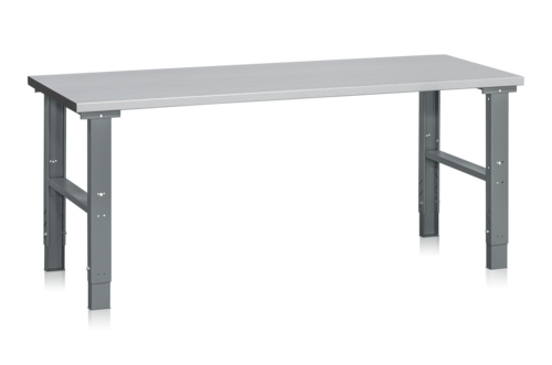 Kompletter Arbeitstisch mit zwei manuell justierbaren Beinrahmen aus Stahl und einer vielseitig einsetzbaren Tischplatte aus Stahlblech (2000x800x40 mm). Maximale Belastung 500 kg verteiltes Gewicht. Minimale Höhe 745 mm, maximale Höhe 1015 mm. Die Tischplatte aus Stahlblech ist für schwere Montage- und Werkstattarbeiten einsetzbar. Eine robuste Platte mit kratzfester und leicht zu reinigender Oberfläche. Der 1,5 mm starke, Aluzink-Stahlblechbelag ist um die Vorder- und Rückkante gebogen. Die Kanten an den kurzen Seiten sind aus grauem ABS. Die Tischplatte hat einen massiven Holzkern und ist mit einer Holzfaserplatte verleimt.