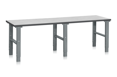 Kompletter Arbeitstisch mit drei manuell justierbaren Beinrahmen aus Stahl und einer vielseitig einsetzbaren Tischplatte aus Vinyl (2500x800x40 mm). Maximale Belastung 500 kg verteiltes Gewicht. Minimale Höhe 745 mm, maximale Höhe 1015 mm. Die Tischplatte aus Vinyl ist für Pack- und Montagearbeiten einsetzbar. Die weiche, graumelierte Vinyloberfläche verringert das Risiko der Beschädigung der zu bearbeitenden Produkte. Umlaufende Kante aus grauem ABS-Kunststoff. Die Tischplatte hat einen massiven Holzkern und ist mit einer Holzfaserplatte verleimt.
