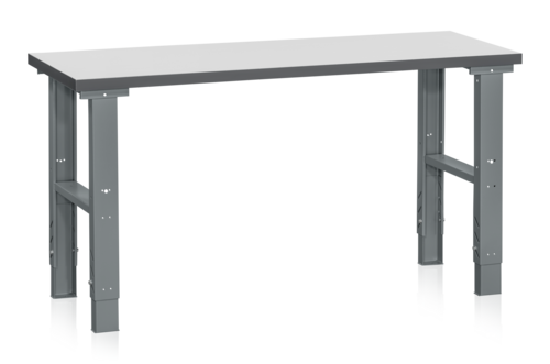 Kompletter Arbeitstisch mit 2 manuell höhenverstellbaren und stabilen HD Beinen aus Stahl und robuster Tischplatte aus grauem Laminat (1600x600x40 mm). Die maximale Belastung beträgt 500 kg verteiltes Gewicht. Mindesthöhe 745 mm, maximale Höhe 1015 mm.