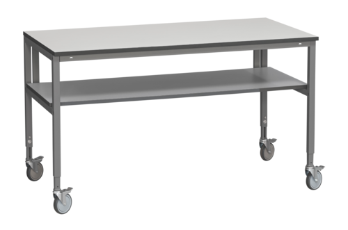 Kompletter Arbeitstisch mit zwei manuell justierbaren Beinrahmen aus Stahl, einer vielseitig einsetzbaren Tischplatte aus grauem Laminat (1600x800x24 mm), einem Zwischenboden aus Laminat (1600x600x24 mm), Anbaurahmen, C-Profil und Rollensatz. Maximale Belastung 300 kg verteiltes Gewicht. Minimale Höhe 885 mm, maximale Höhe 1135 mm. Tischplatte aus Laminat für einfache Montagearbeiten, mit harter und kratzfester Oberfläche mit hoher Widerstandsfähigkeit gegen Flüssigkeiten und Chemikalien. Leicht zu reinigen. Kante in grau ABS. Die Tischplatte hat einen massiven Holzkern und ist mit einer Holzfaserplatte verleimt.