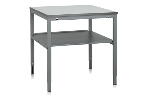 Arbeitstisch mit manuell verstellbarem Tischgestell aus Metall, Tischplatte aus grauem Laminat (800 x 800 x 24 mm) und Zwischenboden. Der Arbeitstisch ist manuell höhenverstellbar mit einer Mindesthöhe von 730 mm und einer Maximalhöhe von 980 mm. Tragfähigkeit 300 kg.