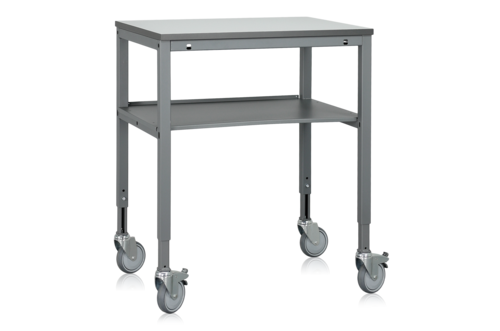 Mobiler Arbeitstisch mit manuell verstellbarem Tischgestell aus Metall, Tischplatte aus grauem Laminat (800 x 600 x 24 mm), Zwischenboden und Rollen. Der Arbeitstisch ist manuell höhenverstellbar mit einer Mindesthöhe von 885 mm und einer Maximalhöhe von 1135 mm. Tragfähigkeit 300 kg.