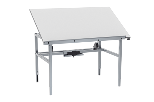 Manuell höhenverstellbarer Arbeitstisch mit elektrisch neigbarer Tischplatte. Der Tisch basiert auf unserem klassischen Arbeitstisch LD300, der mit einer Mindesthöhe von 730 mm und einer Maximalhöhe von 980 mm manuell höhenverstellbar ist. Die Tischplatte ist elektrisch neigbar und kann bis zu 70° geneigt werden. Die neigbare Laminattischplatte verfügt über eine harte und kratzfeste Oberfläche mit guter Beständigkeit gegenüber Flüssigkeiten und Chemikalien. An der Vorderkante befindet sich zusätzlich ein Abrollrand, der von 0–36 mm über der Tischplatte höhenverstellbar ist. Tragfähigkeit 160 kg.