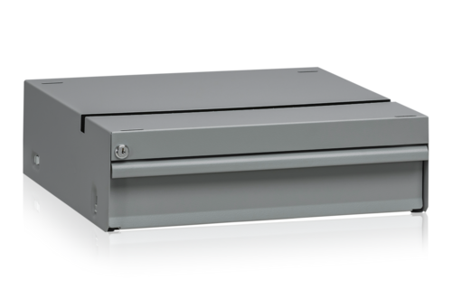 Schublade für mobile Arbeitsstationen zur Montage unter der Arbeitsplatte. Bei Montage der ausziehbaren Schublade an mobilen Arbeitsstationen, kann weder A4-Dokumentenablage, noch Etikettenhalter montiert werden.