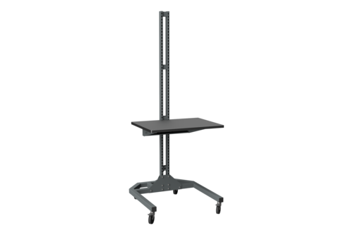 Mobile Arbeitsstation zum Einsatz in Industrie und Lager. Die Arbeitsstation ist mit einer manuell höhenverstellbaren Arbeitsfläche aus Polyeten PE1000 (800x600x25 mm) und vier schwenkbaren Rollen (Rollendurchmesser 100 mm), davon 2 bremsbar, ausgerüstet. An den Lochsäulen kann eine Vielzahl von Standardzubehör sowie Schwenkarme montiert werden. Maximale Belastung 50 kg verteiltes Gewicht.