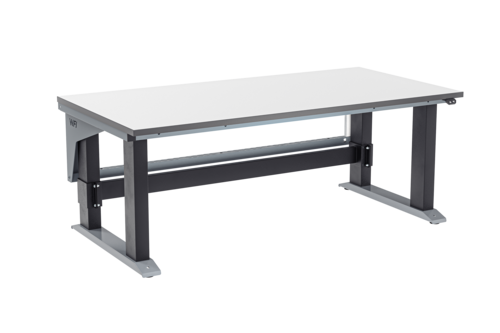 Der Arbeitstisch wird standardmäßig mit einer Laminatplatte geliefert. Diese ist hart und kratzfest und beständig gegen Flüssigkeiten und Chemikalien. Sie lässt sich leicht abwischen und reinigen. Daher eignet sie sich für die meisten Industrie- und Logistikumgebungen. Die Laminatplatte ist 24 mm stark und verfügt über eine Kantenleiste aus 2 mm starkem grauem ABS.