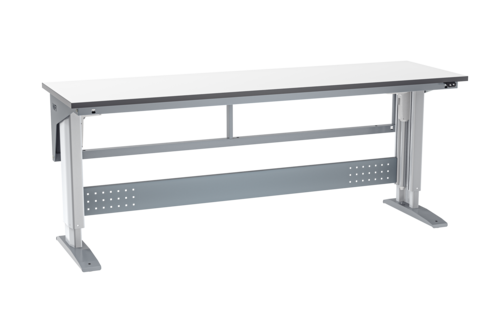 Elektrisch höhenverstellbarer Arbeitstisch für den Einsatz im Industrie- und Logistikbereich. Der Arbeitstisch ist mit zwei Elektromotoren ausgestattet für eine sanfte, geräuschlose und stufenlose Höhenverstellung. Verfahrgeschwindigkeit 15 mm/s ohne Belastung. Die Höhe lässt sich einfach mit einer Tischbedieneinheit einstellen, die an einer beliebigen Stelle an der Tischplatte montiert wird. Die minimale Höhe beträgt 700 mm und die maximale Höhe 1150 mm. Das Tischgestell besteht aus pulverlackiertem Stahl, der sowohl korrosions- als auch verschleißfest ist und eine schmutzabweisend Oberfläche hat. Netzteil 230 V/50 Hz. Ein stabiler Arbeitstisch mit einer Belastbarkeit von 300 kg verteiltem Gewicht.