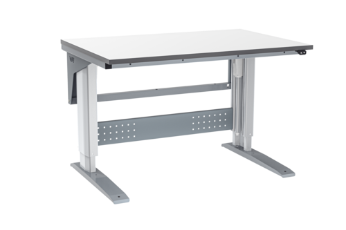 Der Arbeitstisch wird standardmäßig mit einer Laminat-Tischplatte geliefert, die eine harte und kratzfeste Oberfläche hat, mit einer guten Beständigkeit gegen Flüssigkeiten und Chemikalien. Einfach abzuwischen und sauber zu halten. Somit für die meisten Industrie- und Logistikumgebungen geeignet. Die Laminatplatte ist 24 mm stark und hat eine Kante aus 2 mm grauem ABS-Kunststoff.
