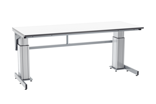 Der Arbeitstisch wird standardmäßig mit einer Laminat-Tischplatte geliefert, die eine harte und kratzfeste Oberfläche hat, mit einer guten Beständigkeit gegen Flüssigkeiten und Chemikalien. Einfach abzuwischen und sauber zu halten. Somit für die meisten Industrie- und Logistikumgebungen geeignet. Die Laminatplatte ist 24 mm stark und hat eine Kante aus 2 mm grauem ABS-Kunststoff.