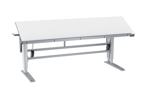 Elektrisch höhenverstellbarer Tisch mit neigbarer Tischplatte für Montagearbeiten. Der Arbeitstisch basiert auf unserem Premiumtisch W400 und hat eine Tragkraft von 400 kg. Niedrigste Höhe 700 mm und maximale Höhe 1150 mm, die Höhe lässt sich einfach mit einer kleinen Bedieneinheit einstellen. Eine zweite Bedieneinheit dient zur Einstellung der Neigung der Tischplatte. Durch die zweigeteilte Tischplatte kann der Tisch wie gewohnt mit Standardzubehör wie Fachböden, Schienen zum Aufhängen von Sichtlagerkästen, Lochplatten und Beleuchtung über dem Tisch ausgestattet werden.