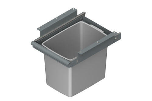 Ausziehbarer Abfallbehälter zur Montage unter der Tischplatte bei Arbeitstischen. Der Abfallbehälter wird von unten mit Holzschrauben in die Tischplatte geschraubt und ist für eine einfache Handhabung und Entleerung des Behälters vollständig ausziehbar. Der Behälter besteht aus Kunststoff und fasst 25 Liter, das Gestell ist aus Blech.