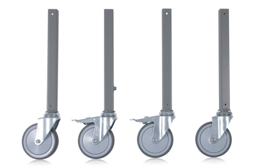 Rollensatz mit 4 lenkbaren Rollen, davon 2 mit Bremse. Rollen zur Montage am Standfuß. Die minimale Tischhöhe erhöt sich um 160 mm. Pulverlackiert in grau NCS S 6502B . Vierkantrohr 32x32 mm. Rohrlänge 350 mm. Rollendurchmesser 125 mm.
