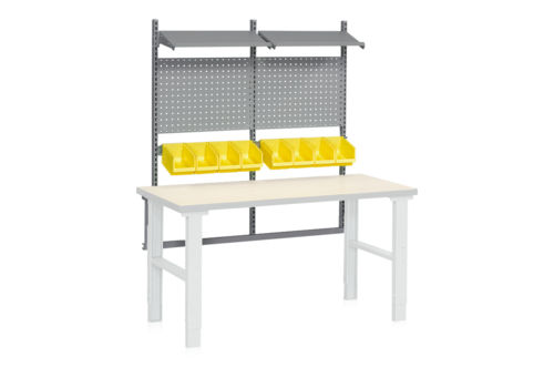 Zubehörsatz bestehend aus 3 Lochstützen (1448 mm), zwei Querstreben (645 mm), einem Anbaurahmen (1520 mm), 3 Montagekits für Lochstützen, zwei grauen Lochrasterplatte (666x480 mm), zwei Regalböden (645x300 mm), zwei grauen Befestigungsschienen (670 mm) und 8 gelben Sichtlagerkästen (4 l). Die Lochstützen sind aus pulverbeschichtetem Metall. Passend für Arbeitstische von 1600 mm Länge.