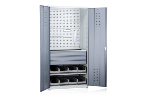 Ein robuster Werkstattschrank in vollverschweißter Stahlblechkonstruktion. Geeignet für anspruchsvolle Umgebungen wie Werkstätten und Lager. Der Schrank ist mit stellbaren Füßen ausgestattet, die einen sicheren Stand auch auf unebenen Flächen gewährleisten, und kann eine Gesamtlast von 500 kg tragen. Grau lackiert in zwei Farbtönen. Der dunkle Farbton der Türen reduziert das Risiko von Schmutz und Fingerabdrücken.