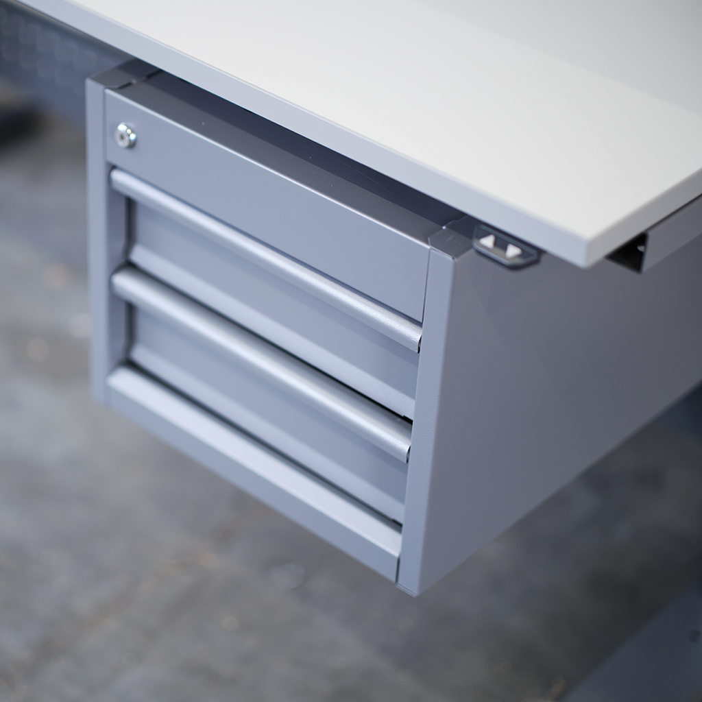Damit Sie an Ihrem Arbeitsplatz ergonomisch arbeiten können, ist es auch wichtig, über funktionale Aufbewahrungsmöglichkeiten zu verfügen. Vor allem eine Aufbewahrung, die der gleichen Hebe- und Senkbewegung folgt wie der Arbeitstisch. Durch das Anheben des Arbeitstisches haben Sie dann leichteren Zugriff auf das, was sich unter der Tischplatte befindet, egal ob es sich um Materialien, Drucker oder Verpackung handelt. Wählen Sie, ob Sie Ihren Stauraum mit einem abschließbaren Schubladenblock oder ausziehbaren Zwischenböden erweitern möchten, die die Flexibilität noch ein wenig erhöhen. Die ausziehbaren Fachböden sind mit Vollauszug ausgestattet, die sowohl die Zugänglichkeit als auch die Übersicht über den Inhalt erhöhen.