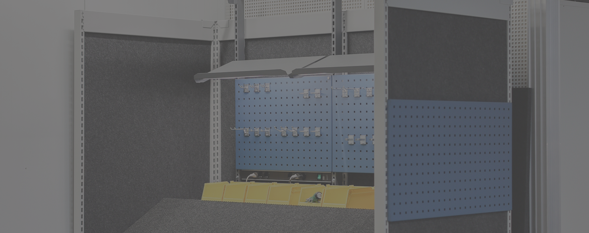 Alle Varianten unserer neuen Trennwände können mit unserem Zubehör 900 mm c/c ergänzt werden. Hier können Sie alles hinzufügen, von perforierten Paneelen zum intelligenten Aufhängen von Werkzeugen und Regalen, die zusätzlichen Stauraum schaffen, bis hin zu einer gewölbten oberen Rampe mit Beleuchtung und Rückleisten mit Kunststoffrückseiten. In welcher Umgebung werden Sie Ihre Trennwand platzieren und wie gestalten Sie sie?