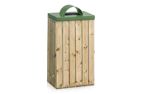 Müllsackhalter aus druckimprägniertem Holzlatten, ohne Metalleinsatz. Vorderseite abnehmbar zur einfachen Entleerung. Grüner Metalldeckel mit Einwurfloch.Spezifikation - Müllsackhalter 125 l Holzlattenverkleidung mit Einwurfloch