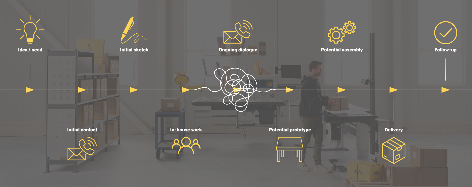 The first step in the process. An idea takes shape, a need arises, or an existing solution calls for improvement. Perhaps your vision is clear and concrete, perhaps it is simply a first thought on streamlining your workflow. To kick off the project and start creating your unique solution, it can be useful to test your idea or need in our configurator, The Yelper. Here, you can build a first base and send directly to us for an initial consultation.
