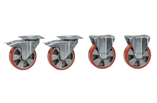 Wheel set in PUR with aluminum hub for tilting container. 2 fixed (unbraked) and 2 swivel (braked) wheels. Wheel size 160 mm and total height 190 mm. Maximum load 1050 kg.