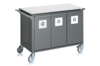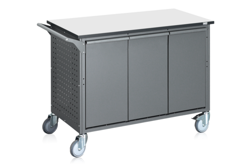 Robust recycling trolley for industrial waste management. Ideal for workplaces looking for a flexible solution for handling, sorting, and emptying waste during the workday. The recycling trolley is equipped with six large containers with a volume of 50 liters each. The containers can be easily lifted off when emptying, or used together with a waste bag adapted for 50 liters. The trolley features sturdy wheels (125 mm), making it suitable for demanding industrial environments. It also includes perforated panels on the front and back for suspension of accessories such as hooks and wire baskets. Laminated top shelf 1100x570 mm.