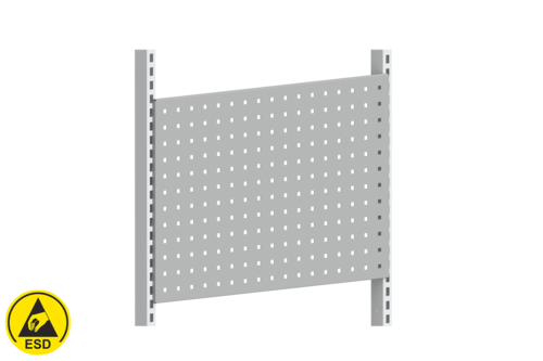 Perforated tool panel with for assembly on perforated pillar. The panel is mounted tight against the pillar to reduce rattles and it builds 14 mm in front of the perforated pillar. Metal thickness 1.5 mm, hole dimension 9x9 mm and hole distance c/c 38 mm. 14 mm folded edge all around.