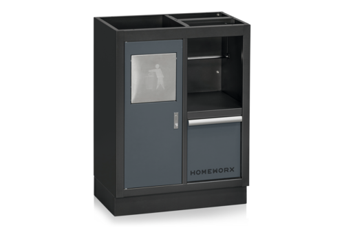 Grey/black base cabinet with space for waste and a paper roll. Perfect for combining with other drawer units, base cabinets, and a countertop to create a complete garage interior setup.