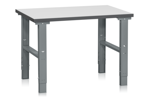 Complete workbench with 2 manually adjustable, stable, heavy h-frame steel legs and an all-round worktop in grey laminate (1200x800x40 mm). Maximum load 500 kg distributed weight. Minimum height 745 mm, maximum height 1015 mm.
