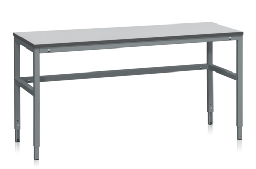 Complete workbench with manually adjustable steel legs, an all-round worktop in grey laminate (1600x600x24 mm) and two C profiles for expansion. Maximum load 300 kg distributed weight. Minimum height 730 mm, maximum height 980 mm.
