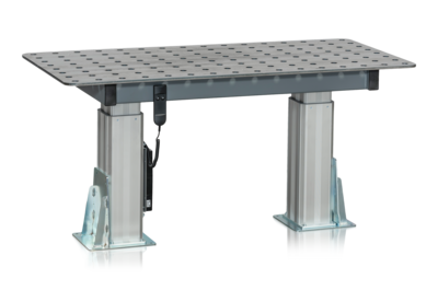 De manuella arbetsborden har ställfötter som går att dra ut och låsa i önskat läge.