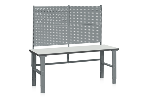 Komplett arbetsbord med manuellt justerbara och stabila tunga benbockar i stål, allroundskiva i vinyl (2000x800x40 mm), påbyggnadsram (1920 mm), 3 perforerade pelare (1448 mm) och 4 grå perforerade paneler (896x480 mm). Maximal belastning är 500 kg fördelad vikt. Lägsta höjd 745 mm, högsta höjd 1015 mm.