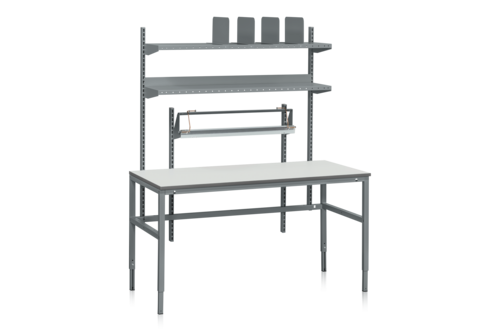 Komplett packbord med grålackerat stativ, höj- och sänkbara ben, bordsskiva i laminat (1600x800x24 mm), 4 perforerade pelare (1448 och 1000 mm), 2 hyllplan (1350x300 mm), 4 hyllavdelare (300x200 mm) och pappersavrivare. Maximal belastning är 300 kg fördelad last. Lägsta höjd 730 mm, högsta höjd 980 mm.