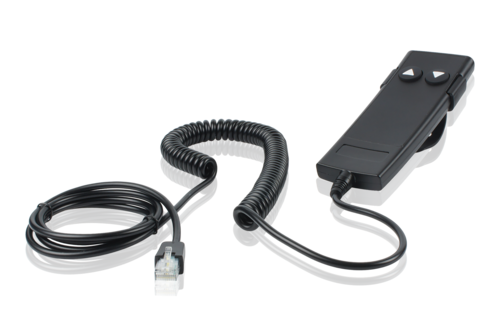 Handkontroll med två knappar för reglering av en motorgrupp. Levereras med spiralkabel med en längd på 3 m och hake. Magnet kan fås som tillbehör.