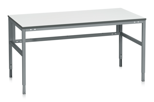 Komplett arbetsbord med manuellt justerbara benpar i stål, en allroundskiva i grå laminat (1200x800x24 mm) och två c-profiler för påbyggnad. Maximal belastning är 300 kg fördelad vikt. Lägsta höjd 730 mm, högsta höjd 980 mm.
