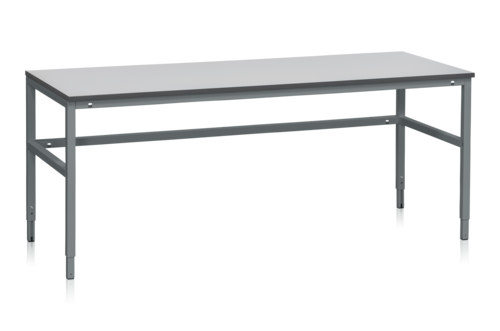 Komplett arbetsbord med manuellt justerbara benpar i stål, en allroundskiva i grå laminat (2000x800x24 mm) och två c-profiler för påbyggnad. Maximal belastning är 300 kg fördelad vikt. Lägsta höjd 730 mm, högsta höjd 980 mm.
