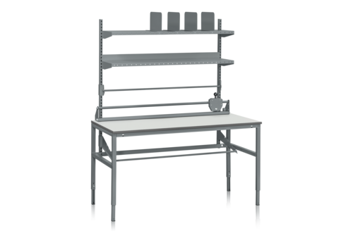 Komplett packbord med grålackerat stativ, höj- och sänkbara ben, bordsskiva i laminat (1600x800x24 mm), 2 perforerade pelare (1448 mm), 2 hyllplan (1350x300 mm), 4 hyllavdelare (300x200 mm), skäraggregat (skärbredd 1200 mm) och rullhållare (1360 mm). Maximal belastning är 300 kg fördelad last. Lägsta höjd 730mm, högsta höjd 980mm.