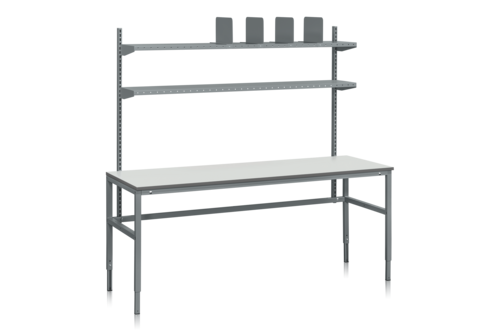 Komplett packbord med grålackerat stativ, höj- och sänkbara ben, bordsskiva i laminat (2000x800x24 mm), 2 perforerade pelare (1448 mm), 2 hyllplan (1800x360 mm) och 4 hyllavdelare (200x360mm). Maximal belastning är 300 kg fördelad last. Lägsta höjd 730 mm, högsta höjd 980 mm.