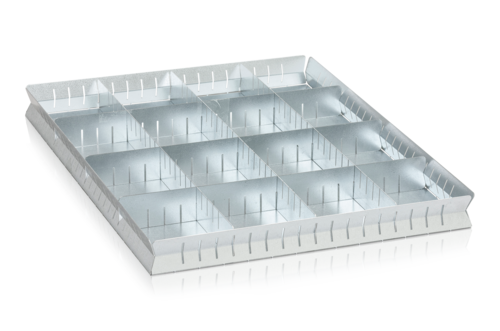Komplett lådinredning som passar samtliga av våra verkstadshurtsar 670. Består av en ram samt tre långa och tre korta plåtprofiler som enkelt kan anpassas efter önskad storlek. Samtliga delar är tillverkade i galvaniserad plåt.
