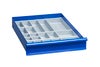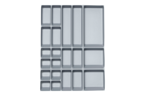 Lådinredning av grå polystyren plast. Lutande framkanter i lådinredning för ett lättare plock av till exempel skruv och mutter.