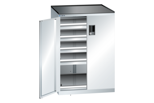 Premiumhurts från LISTA. Verktygshurtsen är tillverkad i en kraftig plåtkonstruktion av allra högsta klass för användning i krävande miljöer. Hurtsen har dörrar, en utdragbar hylla och fyra utdragbara lådor. Även utrustad med ett topplan i plåt med tre raskanter samt ribbad gummimatta. Verktygshurtsen har centrallås med tillhörande nyckel. Både stommen och dörrarna är lackerade i ljusgrå RAL 7035, hyllplan är lackerade i grå NCS S 4502-B.